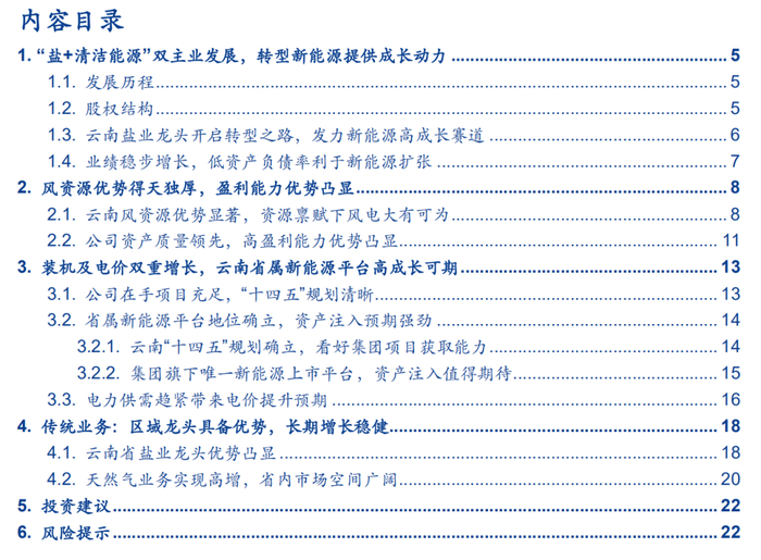 ■“盐+清洁能源”双主业发展,新能源有望成为核心增长点:公司为云南省能源投资集团旗下上市平台,主业涵盖盐业和清洁能源两大板块。公司原主营业务为食盐、工业盐、芒硝和日化盐,2016年和2019年集团分别向公司置入天然气业务和风电业务,逐步向清洁能源领域转型。新能源为公司未来核心发展方向,目前公司共建成运营7个风电场,装机总容量0.37GW。2021年,公司清洁能源业务收入占比为43.48%(天然气业务25.37%,风电业务18.11%),清洁能源的大力发展带动业绩稳增长。2021年,公司营业收入达到22.59亿元,同比增加13.49%;归母净利润达到2.52亿元,同比增长8.71%。