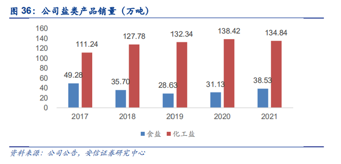 近两年来公司盐业产销量已基本保持稳定。从食盐板块看,从 2017-2019 年受国内盐改政策影响公司食盐销量出现了较大幅度下滑,2020 年以来销量略有回升。工业盐板块 2019年以来公司销量已基本稳定在 130 万吨以上。
