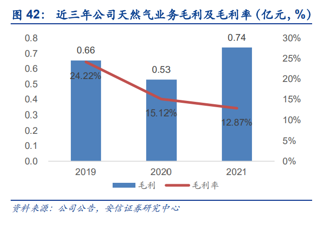 省内用户需求提升推动公司天然气业务进入高速成长阶段。根据年报披露,2021 年公司天然气板块营业收入实现大幅提升,达到 5.7 亿元,同比增加约 65%。营业收入及毛利的大幅增长主要受益于销气量的大幅提升,2021 年公司天然气入户安装量同比增加 80%,天然气售气量达到 2.11 亿立方,连续两年增速达到 70%左右。但 2019 年以来公司天然气业务毛利率出现较大幅度下滑,根据公司在公开投资者问答中披露的信息,可能受到管道气供应趋于紧张、终端用户价格承受能力有限、已运营管道实际输气量与设计输气量存在较大差距等方面的影响。根据公司公告披露,目前公司在云南省内背靠东南亚利用“一带一路”区位优势,根据 2020 年报披露,公司天然气上游接入气源主要为中缅管道,已与云南华油天然气有限公司、中石油西南管道分公司等签订购售气合同。积极开拓川气入滇、桂气入滇等多气源,实行管道气、LNG/CNG 业务共同发展增强供应、调配能力,未来公司天然气成本端有望实现下降。