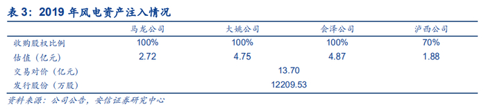 公司为集团旗下唯一上市平台,目前公司体内 4 家风电运营子公司均为 2019 年通过集团资产注入获得。2019 年 3 月公司以发行股份的方式收购集团马龙公司 100%股权、大姚公司 100%股权、会泽公司 100%股权以及泸西公司 70%股权,四家子公司估值合计为 14.22亿元,最终交易对价为 13.7 亿元。参考四家风电公司 2019 年净利润 1.77 亿元,公司约以 8 倍 PE 收购集团风电资产,交易对价相对较低。