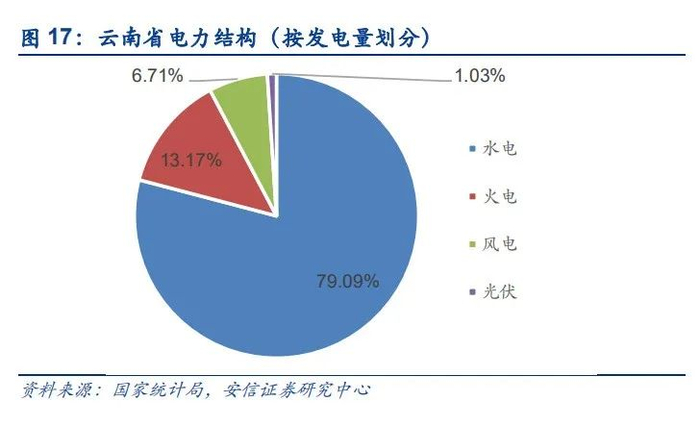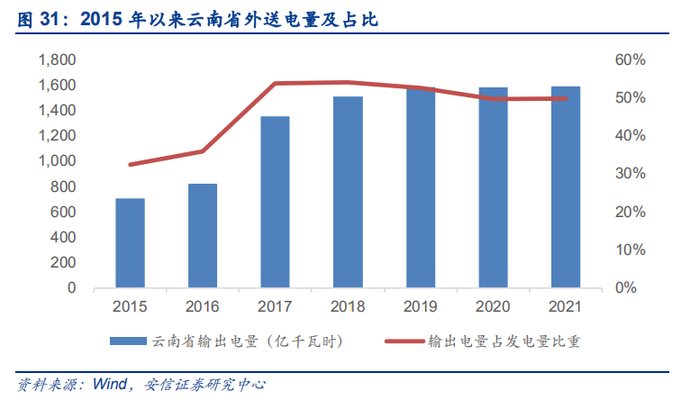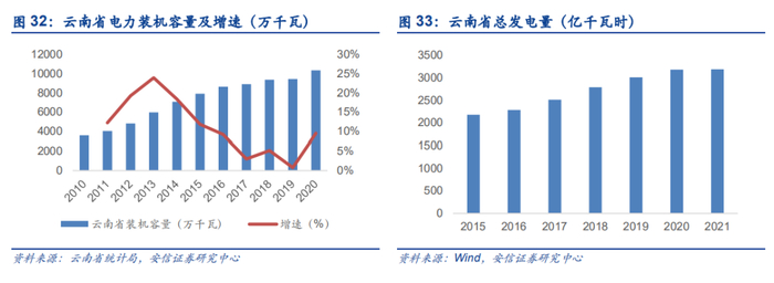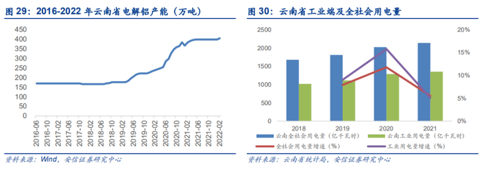 1)云南省积极发展绿色能源,引进硅、铝等产业,第二产业用电需求实现 稳步增长。近年来云南省利用其可再生能源资源优势大力发展绿色能源产业,其中铝、硅等绿色制造业快速发展,目前云南已成为我国电解铝产业 第一大省,省内电解铝产能已从 2016 年的 170 万吨增至 2021 年的 400 万吨,绿色能源产业的大力投产下云南省工业端用电量实现稳步提升2019- 2021年云南省工业端用电量增速分别达到9%、15.8%、5.1%,带动用电需求大幅增长。