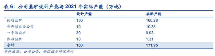 手握云南省核心盐矿资源。产能方面,目前公司拥有云南省盐资源储量最大、品质最高、成本最优的四个盐矿,具有矿床厚、矿层含盐率高、盐层品位高的优质属性,其中昆明盐矿贡献了主要产能(130 万吨),目前公司盐产品总产能为 180 万吨,目前基本实现满产。