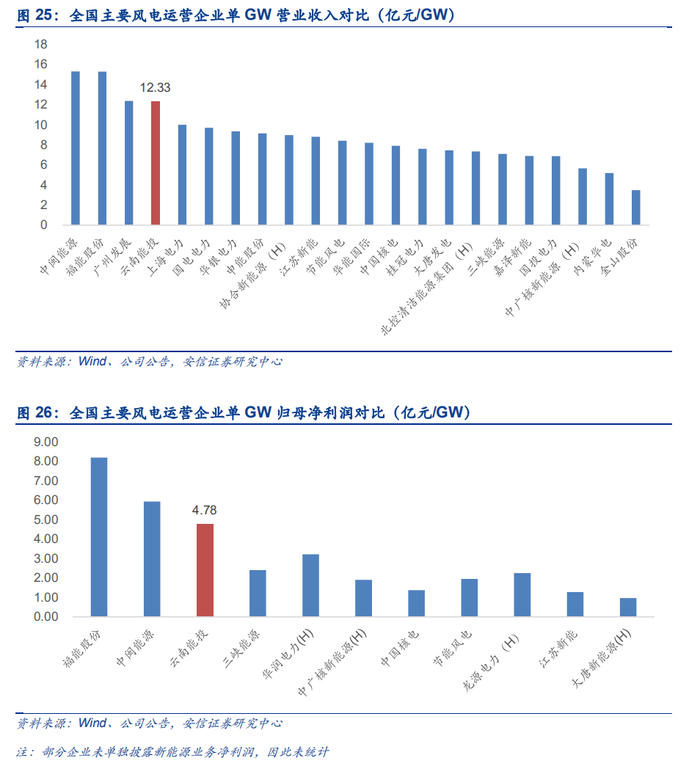 ■资源禀赋保障风电盈利能力:云南省受益于其高海拔优势,风资源优势显著,同时,由于其特殊电力结构,水电为主要电力供应来源,而风电黄金季恰好为枯水期,“水风互补”优势显著,叠加省内消纳能力较强,风电利用效率高,过去几年全省风电利用小时相比全国平均高400-800小时不等。公司项目地处省内风资源优渥地区,利用小时全省领先,2019-2021年公司风电项目平均利用小时数分别为3062小时、3005.72小时和2693.75小时,部分项目达到3500小时以上。高利用小时下公司风电项目盈利能力优势显著,单GW盈利能力达到4.7亿元,在国内风电运营企业中仅次于受益于海风优势的福能股份和中闽能源,远高于大部分风电企业,体现出较高资产质量。