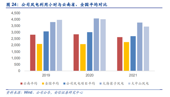 优渥风资源下公司项目利用小时数全省领先。根据公司公告,2019-2021 年公司风电项目平均利用小时数分别为 3062 小时、3005.72 和 2693.75 小时,其中公司大海梁子风电项目和大中山风电项目利用小时数优势显著,大海梁子风电项目 2019-2021 年利用小时数分别为 3790、4073、3754 小时;大中山风电项目利用小时数分别为 3965、4013、3440 小时,大幅领先于国内风电项目平均水平。2021 年公司风电项目利用小时数下滑主要受到云南省风速有所下滑影响。