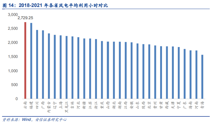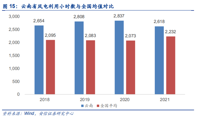 云南省风电利用小时极具优势,常年居全国前二。云南和福建风电利用小时数较其他省份领先,根据 Wind 统计的数据,2018-2021 年云南省风电利用小时数分别为 2654 小时、2808 小时、2837 小时和 2618 小时,而对应的全国平均风电利用小时分别为 2095 小时、2083 小时、2073 小时和 2232 小时,云南省风电利用小时数远高于全国平均,导致风电项目盈利能力较较强。