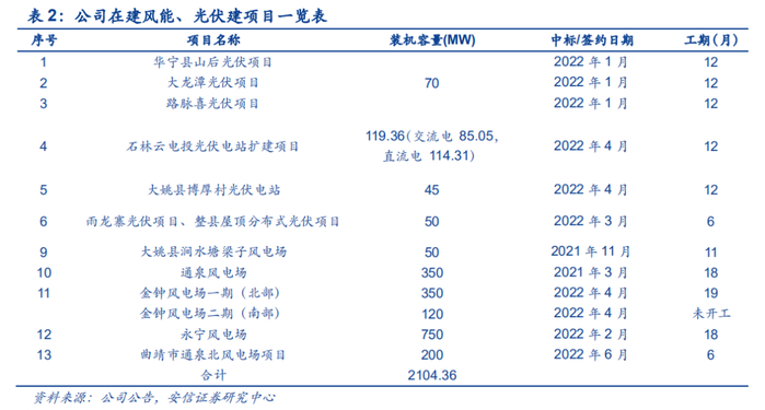 2019年,公司向集团收购马龙公司、大姚公司、会泽公司100%股权、泸西公司70%股权,正式进军风电运营。2021年,公司大姚县涧水塘项目、通泉项目、金钟(一期)项目、永宁等风电项目获得核准。2022年,曲靖市通泉北风电场项目获得核准,此外,还签署华宁县光伏项目及雨龙寨光伏项目合计发电量12 万千瓦,实现光伏发电项目“零突破”,未来光伏和风电有望齐头并进,新能源发电板块有望迎来高增长。