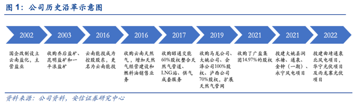 云南能投为云南能源投资集团旗下唯一新能源运营平台,主业涵盖盐业以及天然气、风电、光伏等清洁能源两大板块,新能源是公司未来发展的核心方向。公司成立于2002年,原名云南盐化,于2010年上市,是国家授权云南省唯一的食盐生产企业和云南省政府授权唯一经营碘盐企业,旗下现有“白象牌”盐产品,“艾肤妮”牌日化盐产品,主营业务为食盐、工业盐、芒硝和日化盐。2016年,云南能源投资集团置入天然气业务成为控股股东,剥离氯碱化工业务,公司更名为云南能投,扩充天然气和燃料油销售业务,获取云南省天然气管道项目及城市燃气的特许经营权。