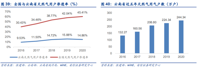 云南省天然气渗透率偏低,未来将有大幅提升空间。近年来云南省天然气用户数量稳步提升,从 2016 年的 132.27 万户增至 2020 年的 244.34 万户,年复合增速达到 16.6%,但云南省天然气用户渗透率仍远低于全国天然气渗透率,2020年全国天然气渗透率为45.41%,而云南省仅为 14.86%,随着下游用户天然气需求持续提升,渗透率将有大幅上涨空间。