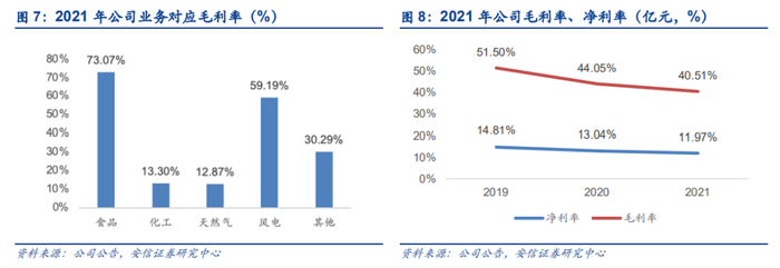盐业仍为目前主要收入来源,风电业务占比近 20%。据公司 2021 年报披露,公司清洁能源业务收入占比为 43.48%(天然气业务 25.37%,风电业务 18.11%),从 2020 年的 8.05亿增长到 2021 年的 9.56 亿,同比增长 21.99%。食品业务收入占比为 31.21%,公司目前风电、光伏在建项目较多,装机规模将从 2023 年起快速提升。