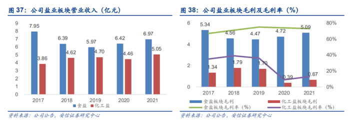 从业绩情况看,近年来公司盐业板块营业收入基本维稳,2017-2019 年食盐板块业绩出现一定程度下滑,2020 年以来化工盐业务毛利率出现大幅下滑,我们分析受以下两方面因素影响: