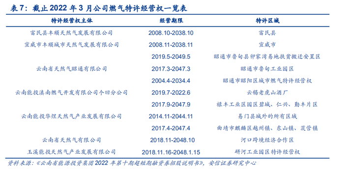 公司天然气业务扎根于云南省内,根据 2021 年报披露,公司依托全资子公司云南天然气搭建了云南省天然气供应管道网络和资源调控平台,拥有省内包括昆明、大理、楚雄、文山等地区共计 18 条天然气支(专)线管道项目、3 个应急气源储备中心项目和 1 个 CNG 母站项目,已建成通气及具备通气条件支(专)线管道合计 727km,稳居省内第一,根据 2020年年报,已通气或具备通气条件支线管道总里程数约占全省通气支线管道里程数的 50%。