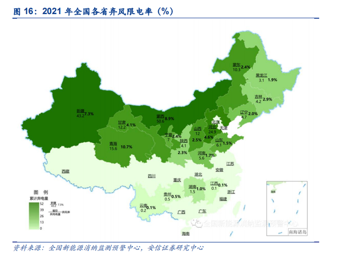 2)相比于内蒙、甘肃、新疆、青海、宁夏等风速较高、风资源领先的地区,云南省新能源消纳能力更强。弃风限电一直是制约风电行业发展的一项重要因素,在“三北地区”尤为严重。根据全国新能源消纳监测预警中心统计的数据,2021 年我国北部地区弃风率仍较为严重,青海、蒙西、新疆、河北、甘肃地区弃风率分别为 10.7%、8.9%、7.3%、4.6%和 4.1%,虽上述地区风资源优渥,但消纳能力的不足限制了利用小时,而云南省 2021 年弃风率仅为 0.1%,基本可实现全额消纳。