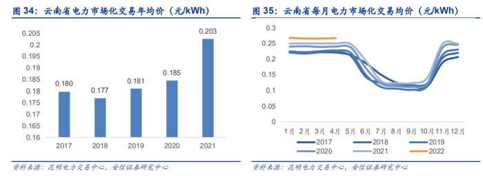 近年来云南省以电价优惠政策积极引进硅、铝产业,高耗能产业持续扩张叠加“西电东送”任务,云南省电力需求大幅增长,供需错配问题明显缓解,市场电价逐步提升:
