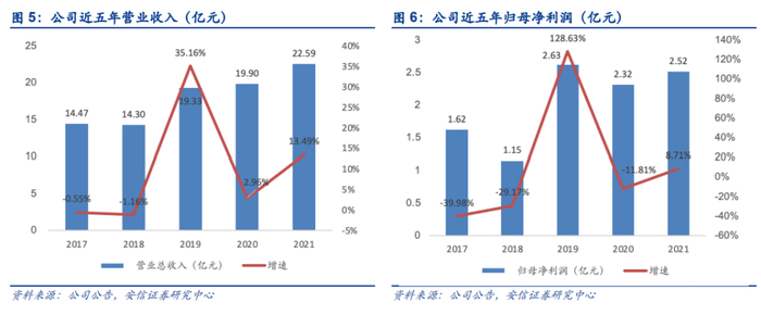 公司营业收入稳步增长,归母净利润保持稳定。根据年报披露,公司 2021 年营业收入与归母净利润均有所提升,营业收入达到 22.59 亿元,同比增加 13.49%。归母净利润达到2.52 亿元,同比增长 8.71%。2021 年的业绩增长主要受益于天然气业务的扩张,天然气业务收入同比增加 65%,售气量同比增长 70%,入户安装量同比增长 80%。公司通过管网拓展、增建应急储备中心优化存量市场的供应量和调配能力,从而带动增长下游尤其是大型工业用户用气量。此外,公司积极拓展省外业务,2021 年省外收入达 3.38 亿,同比增加 19.84%。