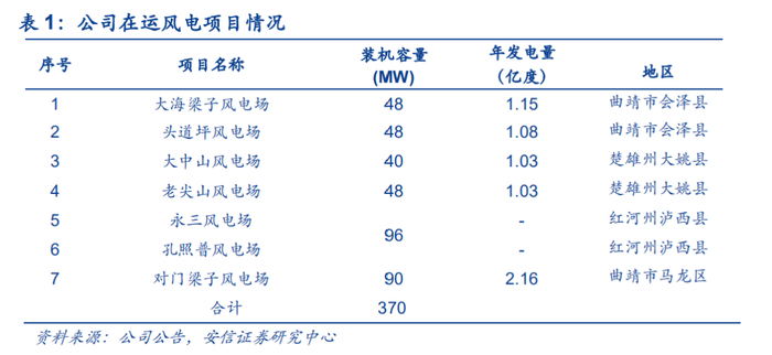 公司风电项目地理位置优越,利用小时高于全省平均。根据北极星电力网发布的云南省年平均风速分布图,云南省风资源优越的地区主要集中于东部以及北部地区。公司目前在运的 7 个风电项目分别地处于曲靖市会泽县、曲靖市马龙区、楚雄州大姚县以及红河州泸西县,均为云南省风资源相对优越的地区,项目资产质量具有保障。同时,由于公司风电项目所在地区人口基数大,用电量占云南省用电总量的 67%,电力消纳具有保障。