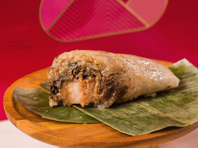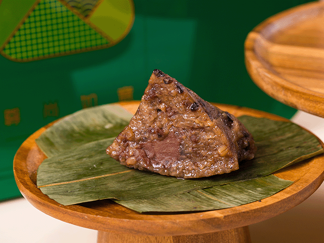 梅菜扣肉为客家名菜之一,看似简单却制作繁复。扣肉肉质软腍又带有梅菜的香气,将其融入粽子中,呈现家乡味,一解思乡情。