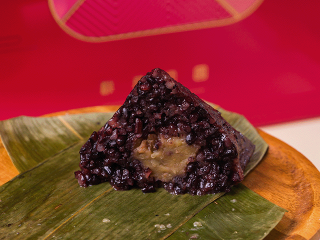 由五种黑色食物:黑糯米、黑豆、黑藜麦、黑米、黑枸杞,配上香浓回甘的陈皮豆沙作馅料,口感层次丰富,回味香浓。
