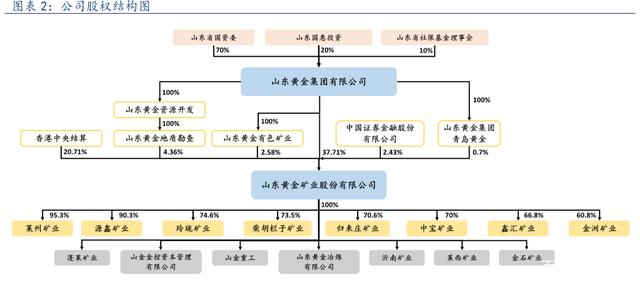 公司控股股东为山东黄金集团有限公司,实控人为山东省国资委。截至 2021 年底,集团公司直接持股比例为 37.71%,其控股的一级子公司山东黄金有色矿业持有公司 2.58%的股权、青岛黄金持有 0.7%的股权以及其二级子公司山东黄金地质矿产勘查有限公司持有公司 4.36%的股权,因此集团公司总共直接或间接持有公司 45.35%股份,股权较为集中。