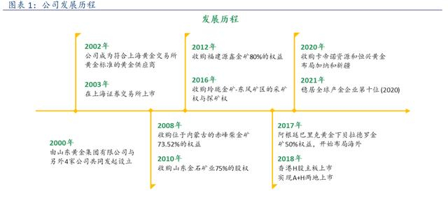 山东黄金于 2000 年成立,隶属于山东黄金集团。2003 年,公司在上交所挂牌上市。2008 年,公司收购首个山东省外矿山赤峰柴金矿,实现了在内蒙古的黄金矿山布局。2012 年收购福建源鑫金矿 80%权益,实现在福建省黄金矿山战略布局。2017 年,公司收购阿根廷巴里克黄金下贝拉德罗金矿 50%权益,正式开启全球化发展。2018 年,公司在港交所主板上市,实现了 A+H 两地资本市场新布局。2020 年公司先后着手收购卡帝诺资源和恒兴黄金,并于 2021 年正式落地,实现了在加纳和新疆的资源布局。截至目前,公司在国内已经拥有 13 座黄金矿山,并全部进入全国绿色矿山名录,拥有 2 座海外黄金矿山。