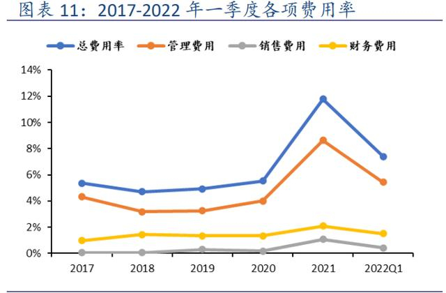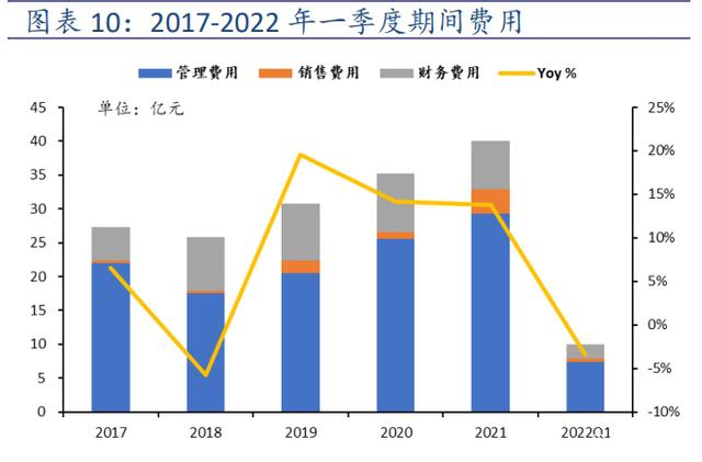 2021 年期间费用总额为 40.02 亿元,同比增长 13.79%,具体来看,销售费用增加 2.54 亿元,同比增长了 237.06%,主要原因是本期公司子公司山金期货有限公司的销售佣金增加;管理费用增加 3.76 亿元,同比增 12.19%。从费用率角度来看,2021 年期间费用率为 11.79%,同比增加了 6.27pct,主要受 21 年产能下降的影响,导致销售收入大幅下降,而职工薪酬等开支反而上涨。 2022 年第一季度,期间费用总额为 9.96 亿元,同比下降了 3.49%;期间费用率为 7.39%。(报告来源:未来智库)