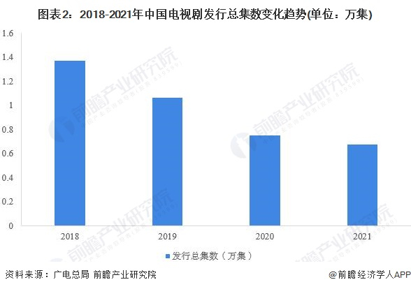 随着我国电视剧发行量的持续下降,我国国产电视剧总发行集数也在持续回落,到2021年,全国电视剧发行总集数为0.67万集,较2018年已下降近50%。