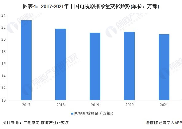 从电视剧整体播放情况来看,2017年以来,全国电视剧总播放量虽有下滑,但总体保持在20万部以上水平,到2021年,全国电视剧播放量为20.89万部。