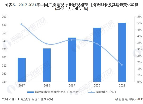 影视剧总播放时长方面,据广电总局统计数据显示,2017年以来,我国影视剧节目播放规模平稳提升,到2021年,全国影视剧节目播放总时长为884.33万小时,较上年同期增长1.29%,整体增速为近五年最低。