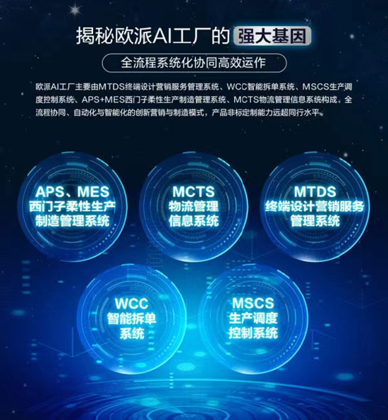 欧派后端强大的AI智造系统,实现了销售、研发、生产制造、物流运输的前后端打通。全球订单,可24小时传送到总部,AI智能受理、AI智能审图、AI智能秒级排产。生产指令24小时传送到全国五大生产基地,智能备料、智能切割、智能封边、智能打孔、智能分拣。产品最快可实现7天交付,行业内望尘莫及。