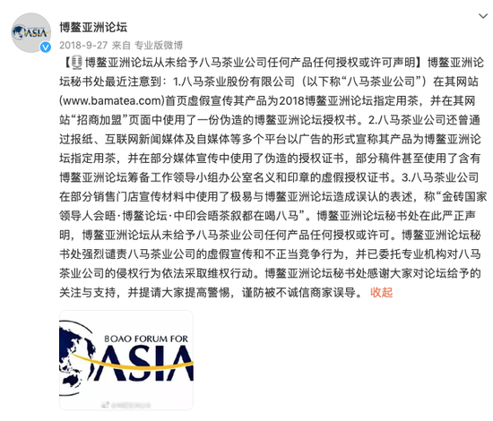 2018年9月27日,博鳌亚洲论坛官微发布微博:“从未给予八马茶业公司任何产品任何授权或许可声明。”