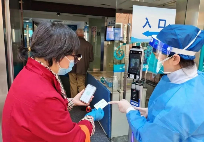 “您好,请打开‘随申码’,在这里扫一下。”5月9日下午1点半,天山路街道社区卫生服务中心全科门诊开诊。在工作人员的指引下,走进中心就诊的居民出示提前准备好的当日“随申码”,配合流调及测温,扫描“场所码”,或通过“数字哨兵”验证“绿码”进入医院。