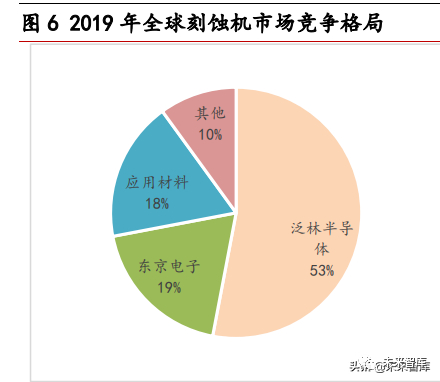 泛林半导体等国际巨头垄断全球及国内刻蚀设备市场。在 2019 年全球刻蚀机市场竞争 格局中,泛林半导体、东京电子、应用材料三大巨头分布占据 53%、19%、18%的市场份 额,其他企业分食余下 10%。在国内市场中,泛林半导体一家独大,占据 52%的市场份 额,中微公司和北方华创分别占据约 20%、6%的市场,东京电子和应用材料分别占 9%、 5%,其余企业分食 8%。可见中微公司在国内刻蚀机领域已形成相对领军之势,其刻蚀设 备占营收比重高达 57%。