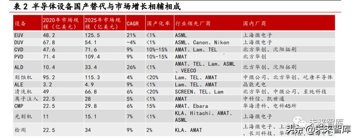 总体来说,半导体设备市场的国产替代必要性和市场增长驱动性相辅相成。纵览设备市场,我国在多个领域的国产化率均低于 1%,如 EUV 光刻机、DUV 光刻机、ALD 设备、ALE 设备、离子注入设备等。在已有一定程度积累的设备领域,国产化率同样位于较低水平, 如刻蚀机的国产化率仍低于 20%,CVD、PVD 设备的国产化率位于 10%-15%,这与下游晶 圆厂的成本置换、投资风险、技术协调性等考虑相关。因此半导体设备国产替代仍有较 长的路要走,且随着中美科技竞争而变得逐渐迫切。但下游市场的增长拉动却是相对稳 健的,如 EUV 光刻机市场近五年复合增长率预计为 21%,ALD 设备市场近五年复合增长 率预计为 26%。在市场红利和大国竞争的双重带动下,尽管有多个国际巨头垄断市场, 但预计国内厂商将在不同子领域不断取得技术突破和地位提升。(报告来源:未来智库)