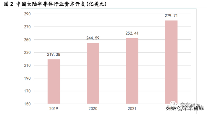 半导体设备是芯片制造的主要器材,受益下游需求增长拥有持续高企的市场景气度。物 联网、人工智能、新能源汽车、5G等新兴科技产业的大发展对整体芯片市场提出了暴增 式的需求,进而为晶圆厂资本开支提供了不断上升的动力。据Gartner数据,中国大陆半 导体行业资本开支有望从2019年的219.38亿美元增长至2022年的279.71亿美元。大量资 本开支主要用于相关产线建设,尤其设备的购买。并且,由于新兴科技对芯片产品性能、 集成度等要求不断提高,导致芯片制程不断精进,国际先进水平已至3nm,使得相关制造 设备的投资成本显著增长,为半导体设备提供了除规模增长之外的价值量提升。