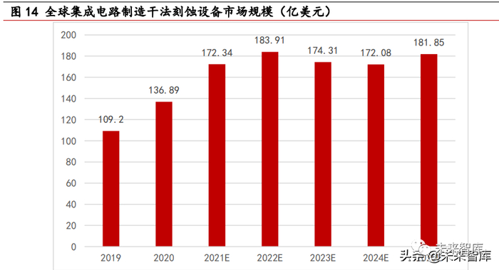 在薄膜沉积、刻蚀、光刻三大半导体设备中,前两者之于我国资本市场的意义尤为重要。因其技术水平、市场份额突破等相对光刻机来说已取得较为长足的进展,且已贡献出两 家代表性上市公司——北方华创和中微公司。薄膜沉积和刻蚀设备是北方华创的主要产 品之一,同时其还覆盖了其他多种如清洗机、氧化扩散等设备。而中微公司是以刻蚀设 备为主打,以 MOCVD 等设备为重要延伸的专长性技术企业。刻蚀是指通过溶液、离子等 方式剥离晶圆表面材料,从而达到芯片结构设计要求的一种工艺流程。刻蚀可分为湿法 刻蚀和干法刻蚀两类,相比湿法刻蚀,干法刻蚀精确度、洁净度更高,因此随着芯片技术进入纳米阶段,干法刻蚀逐渐成为主流,但设备复杂度和成本也较高。据 Gartner 数 据,到 2025 年,全球集成电路制造干法刻蚀设备市场规模预计将增长至 181.85 亿美元。