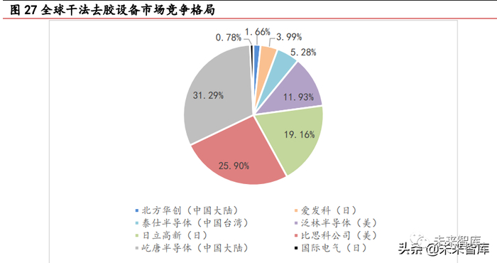 最后,去胶机的技术难度相对而言不特别高,国产厂商在全球市场中已具有较强的市场 竞争力。据Gartner数据,屹唐半导体在全球干法去胶设备市场中占比约31.29%,位居全 球第一,泰仕半导体占比约5.28%,北方华创占比约1.66%。去胶机主要用于晶圆片刻蚀 后去除其表面阻挡层的光刻胶,适用于50-300mm晶圆片的处理。屹唐半导体凭借高企的 全球市占率逐渐确立了在干法去胶设备细分市场中国际领先的地位。(报告来源:未来智库)