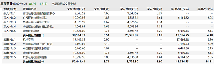 无独有偶,该营业部出现在同一天的奥翔药业龙虎榜中,也是没有买入,只有卖出7190万元。