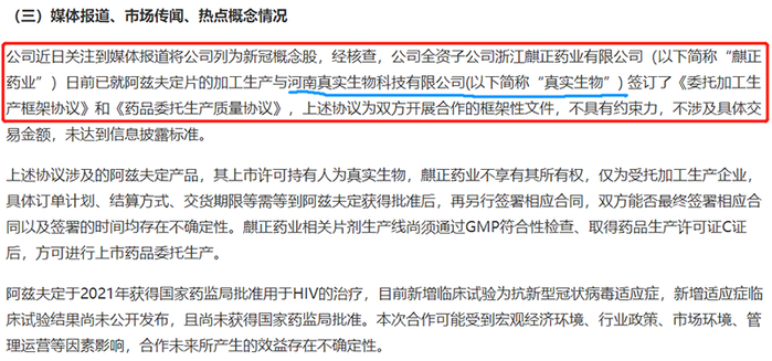 这是继新华制药、华润双鹤之后,第三家承认与真实生物有合作的概念股。