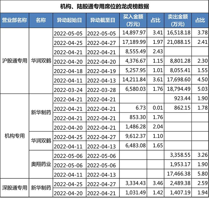 华润双鹤龙虎榜显示,在4月11日-13日、4月25日-27日期间,机构席位分别买入6483.08万元、9612.37万元,合计买入金额超过1.6亿元。