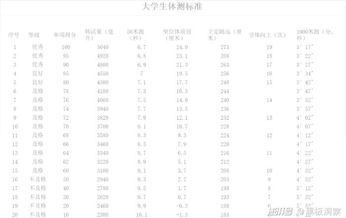 要求变高了,但大三大四学生的水平却比大一大二的时候退化了。一项针对国内某大学学生体育成绩的研究显示,大二学生的体测成绩最好,之后年级越高,学生的体测成绩越差。其实不难理解,大三大四的学生要开始面对升学或就业压力,锻炼时间减少,体能自然比不上刚上大学的时候。
