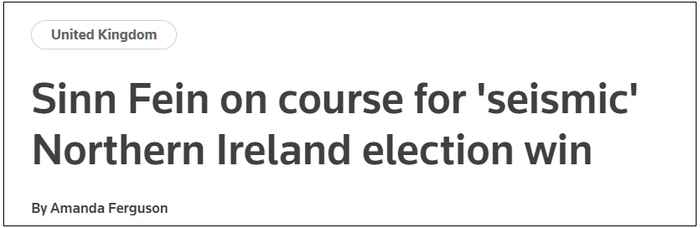 (观察者网 讯)当地时间5月7日,北爱尔兰议会选举结果出炉,寻求脱离英国的新芬党获得了议会中最多的27席,取得历史性胜利,北爱尔兰将产生101年以来第一个民族主义政府。这一结果随即在英国政坛引发了连锁反应,路透社称之为“政治地震”。
