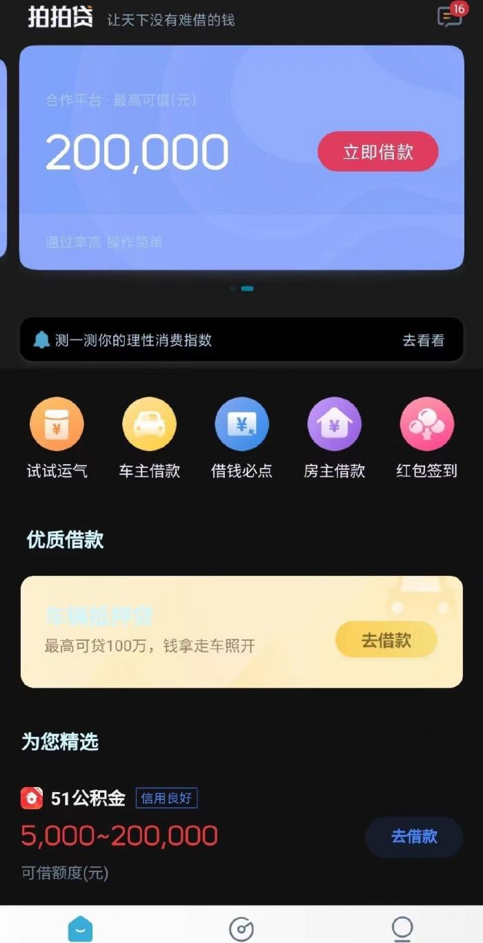 信也科技借贷APP“拍拍贷借款”与“融360”类似,贷款产品名称为“精选贷”,主要功能是为消费者匹配其他贷款平台。值得注意的是,在填选贷款金额时,拍拍贷的起贷金额为1万元。