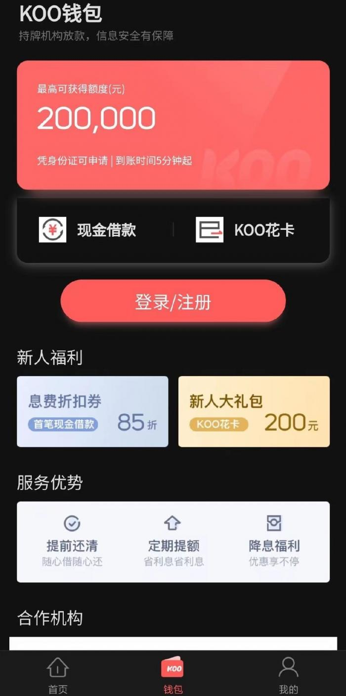 信也科技除“拍拍贷借款”外,还有一款消费贷APP“KOO钱包”,该APP的运营,所属集团为拍拍融信,提供现金借款和KOO花卡两款产品。现金借款可直接提取现金,而KOO花卡则仅能在消费场景中使用,可绑定微信钱包。经多次尝试,该APP均未通过研究组成员的贷款申请。但信也科技表示,他们目前仍有自营贷款业务,并不仅仅导流其他贷款机构。此外,该APP也未明示年化利率。