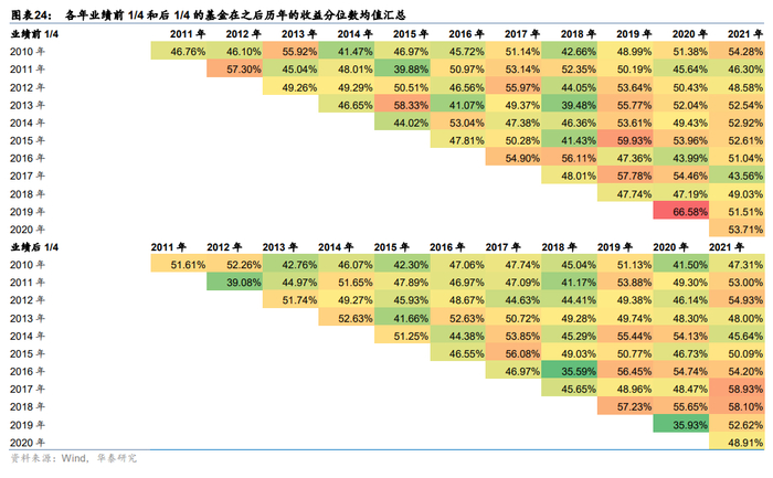 我们按照上述计算示意图的做法,分别统计2010年至今历年业绩靠前和靠后基金的收益表现情况,把上述各年业绩前1/4和后1/4的基金在之后每年的收益分位数的均值进行汇总展示如下。举例来说,对于2010年收益排在前1/4的基金,首先获取它们在2011年至2021年每年的收益率,同类基金按收益率排序后得到基金的收益分位数(收益越高,收益分位数越大),然后分别统计2010年的绩优基金在其他年份中收益分位数的均值。