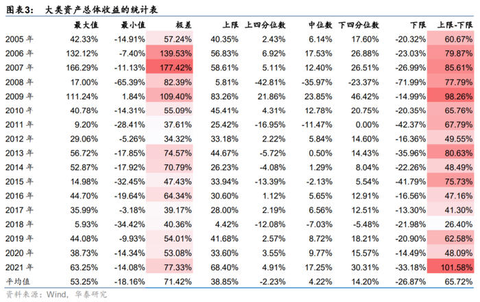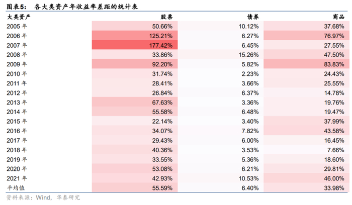 历年最优和最差大类资产收益相差至少30pct,平均可达71pct