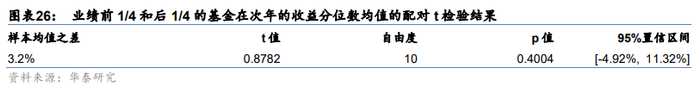 考虑到业绩前1/4和后1/4的基金在每年的业绩表现存在相关性,我们对两组数据进行配对t检验,备择假设为:业绩前1/4和后1/4的基金在次年的收益分位数之差不为0。配对t检验的结果如下: