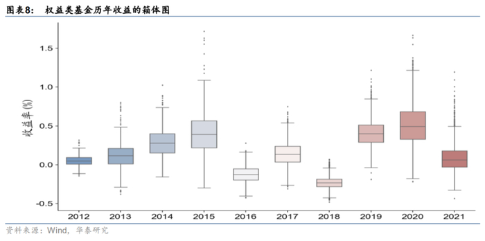 最后观察国内公募基金产品之间的收益差距,我们按照Wind开放式基金分类,将基金划分为权益类基金和债券类基金,对2012年至2021年十年间的公募基金年度收益率进行统计。其中,权益类基金包括股票型基金、混合型基金中的偏股混合型基金以及灵活配置型基金中股票市值占基金资产净值比超过50%的基金。由于灵活配置型基金的每年股票资产占比会发生变化,我们会通过每年的年报决定当年该基金是否计入权益类基金。权益类基金和债券类基金的年度收益箱体图如下。