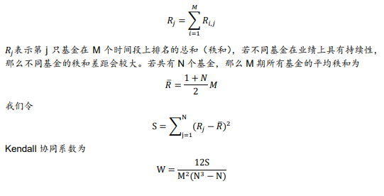 3)Kendall协同系数检验法在1970年由Altman和Schwartz应用在基金业绩持续性研究。Kendall协同系数检验法将整个样本期划分为M个时间段,在每个时间段上都对基金业绩进行排序,我们令Ri,j表示第j只基金在第i个时间段上基金业绩的排名(秩),则