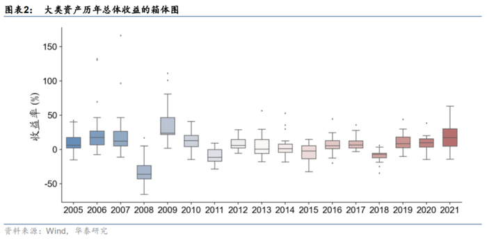 首先我们绘制出上述所有大类资产年度收益的箱体图,横坐标为年份,纵坐标为标的年收益率,箱体的上下界为上四分位数和下四分位数,中间直线为中位数;上直线为上限,是非异常范围内的最大值,下直线为下限,是非异常范围内的最小值。上下限之外的是异常值点。
