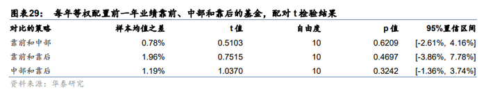 虽然从整体上来看,每年等权配置前一年业绩靠前的基金,其年化收益率略优于等权配置业绩位于中部和靠后的基金,但是从配对t检验结果中可以看出,三组检验的p值均大于0.1,说明三种策略在每年的收益率并没有显著差别。