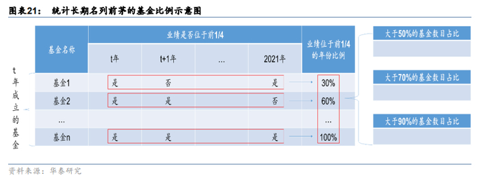 首先,我们计算权益基金每年的复权单位净值增长率在同类基金的百分比排名,然后统计这些基金排名在前1/4的年份数量占其运作总年份数量的比例,记为该基金业绩名列前茅的年份占比。接着我们判断每一只基金业绩名列前茅的比例是否超过了50%、70%和90%。对于同一年成立的基金,我们将业绩名列前茅的比例超过50%、70%和90%的基金数量求和,并除以该年份成立的总基金数量,得到能长期保持绩优的基金比例。上述统计方法的示意图如下: